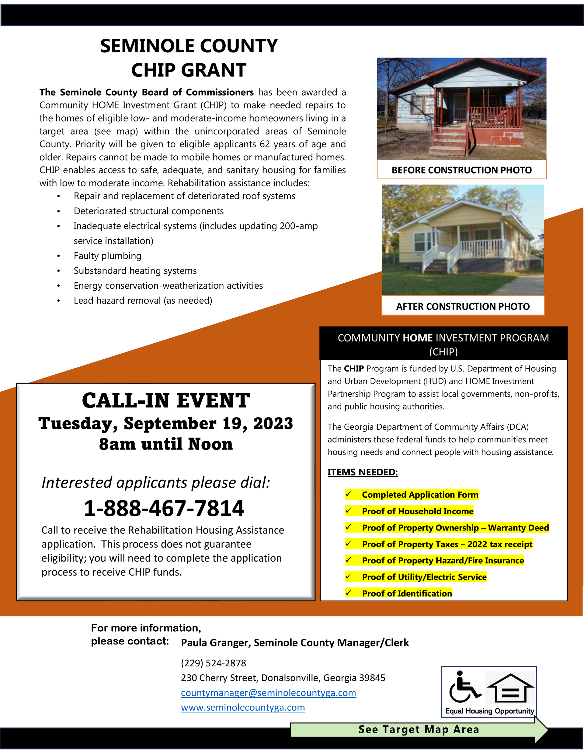 The Seminole County Board of Commissioners has been awarded a Community HOME Investment Grant (CHIP) to make needed repairs to the homes of eligible low- and moderate-income homeowners living in a target area (see map) within the unincorporated areas of Seminole County. Priority will be given to eligible applicants 62 years of age and older. Repairs cannot be made to mobile homes or manufactured homes.