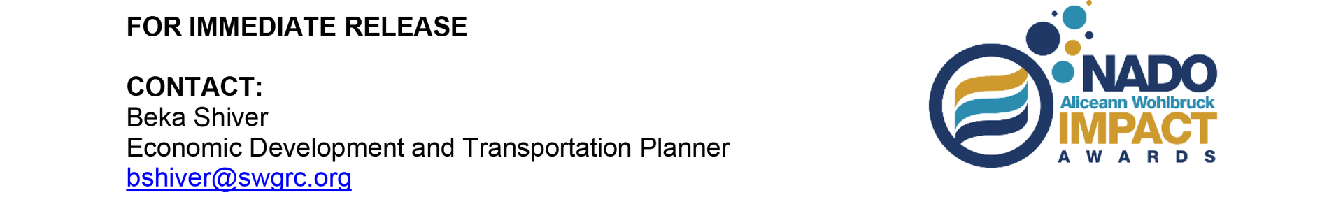 Presented annually, the NADO Impact Awards honor regional development organizations and their partners for strengthening communities, building regional resilience, and enhancing local economies through innovative approaches to economic and community development. NADO is a Washington, DC-based membership association of regional development organizations that promotes programs and policies that strengthen local governments, communities, and economies.